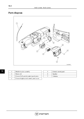 56-2 Audio system- Audio system Parts diagram 56 1 Middle bracket assembly 5 Central control panel 2 Stereo unit 6 Speaker 3 Cover of left central control panel screw 7 Antenna 4 Cover of right central control panel screw Page 1260