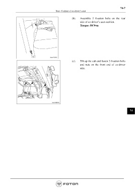 74-7 Seat- Cushion of co-driver’s seat (b). Assemble 2 fixation bolts on the rear side of co-driver’s seat cushion. Torque: 50 N•m (c). Tilt up the cab and fasten 2 fixation bolts and nuts on the front end of co-driver side. 74 Page 1487