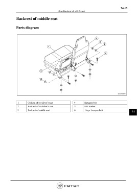 74-13 Seat-Backrest of middle seat Backrest of middle seat Parts diagram 1 Cushion of co-driver’s seat 4 Hexagon bolt 2 Backrest of co-driver’s seat 5 Flat washer 3 Backrest of middle seat 6 1 type hexagon bolt 74 Page 1493