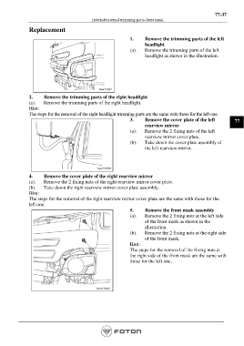 The steps for the removal of the right headlight trimming parts are the same with those for the left one.