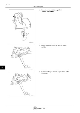 32-12 Clutch-clutch pedal (c). Screw down the clutch pedal pin bolt. Torque: 20 ± 3.5 n•m (d). Install the push rod clevis pin of clutch master cylinder. 32 (e). Install the cotter pin and lock it up as shown in the illustration. Page 992