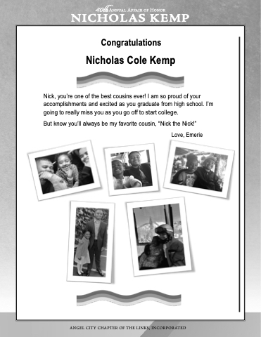 Nick, you’re one of the best cousins ever! I am so proud of your accomplishments and excited as you graduate from high school. I’m going to really miss you as you go off to start college.