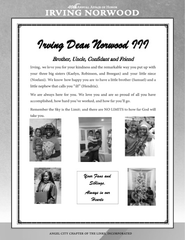 40th Annual Affair of Honor IRVING NORWOOD Irving Dean Norwood III Brother, Uncle, Confidant and Friend Your Fans and Siblings, Always in our Hearts ANGEL CITY CHAPTER OF THE LINKS, INCORPORATED