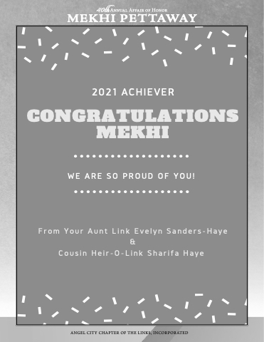 40th Annual Affair of Honor MEKHI PETTAWAY 2021 ACHIEVER CONGRATULATIONS MEKHI WE ARE SO PROUD OF YOU! From Your Aunt Link Evelyn Sanders-Haye & Cousin Heir-O-Link Sharifa Haye ANGEL CITY CHAPTER OF THE LINKS, INCORPORATED