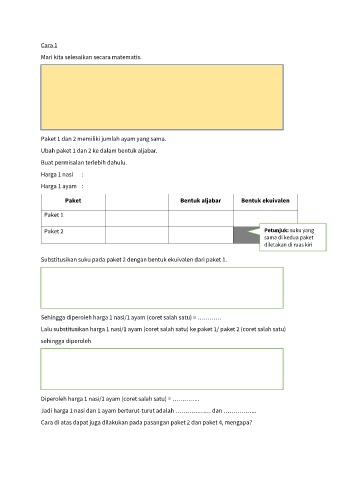 Sehingga diperoleh harga 1 nasi/1 ayam (coret salah satu) = …………