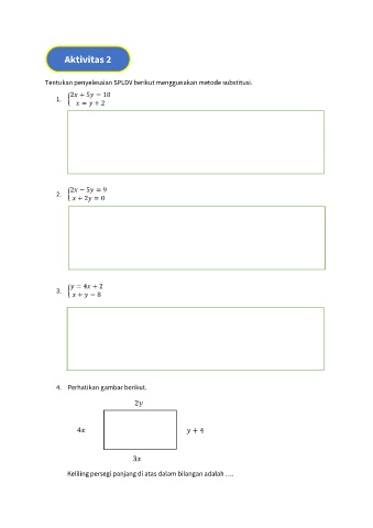 Aktivitas 2 Tentukan penyelesaian SPLDV berikut menggunakan metode substitusi. 2 + 5 = 18 1. { = + 2 2 − 5 = 9 2. { + 2 = 0 = 4 + 2 3. { + = 8 4. Perhatikan gambar berikut. 2 4 + 4 − 6 3 + 5 Keliling persegi panjang di atas dalam bilangan adalah ….