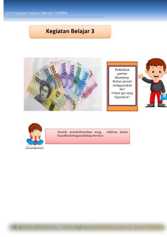 Unit Kegiatan belajar Mandiri (UKBM) Kegiatan Belajar 3 Perhatikan gambar disamping. Kalian pernah menggunakan itu? Untuk apa uang digunakan? Setelah mendeskripsikan uang, silahkan kalian lanjutkankekegiatanbelajarberikut