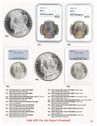 138.) 1882 CC Morgan Silver Dollar (PCGS) MS65. 147.) 1884 O Morgan Silver Dollar (ANACS) MS64. Bright White