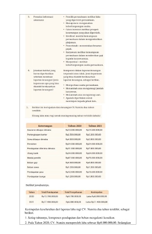 Kesimpulan keseluruhan dari laporan laba rugi CV. Namira dua tahun terakhir, sebagai berikut. 1. Setiap tahunnya, komponen pendapatan dan beban mengalami kenaikan. 2. Pada Tahun 2020, CV. Namira memperoleh laba sebesar Rp8.000.000,00. Sedangkan