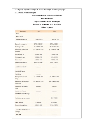 2. Lengkapi laporan keuangan di bawah ini dengan nominal yang tepat! a. Laporan posisi keuangan Perusahaan Umum Daerah Air Minum Kota Sukabumi Laporan Neraca/Posisi Keuangan Periode 31 Desember 2021 dan 2020 (dalam rupiah)