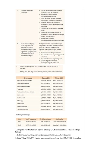 Kesimpulan keseluruhan dari laporan laba rugi CV. Namira dua tahun terakhir, sebagai berikut. 1. Setiap tahunnya, komponen pendapatan dan beban mengalami kenaikan. 2. Pada Tahun 2020, CV. Namira memperoleh laba sebesar Rp8.000.000,00. Sedangkan
