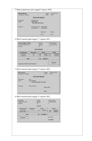 5. Bukti pengeluaran pada tanggal 5 Agustus 2022. 6. Bukti transaksi pada tanggal 11 Agustus 2022. 7. Bukti transaksi pada tanggal 12 Agustus 2022. 8. Bukti transaksi pada tanggal 13 Agustus 2022.