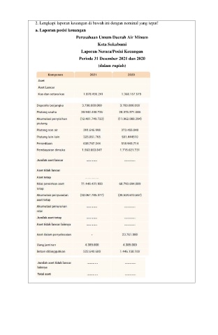 2. Lengkapi laporan keuangan di bawah ini dengan nominal yang tepat! a. Laporan posisi keuangan Perusahaan Umum Daerah Air Minum Kota Sukabumi Laporan Neraca/Posisi Keuangan Periode 31 Desember 2021 dan 2020 (dalam rupiah)