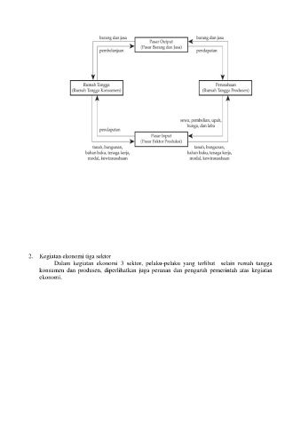 2. Kegiatan ekonomi tiga sektor Dalam kegiatan ekonomi 3 sektor, pelaku-pelaku yang terlibat selain rumah tangga konsumen dan produsen, diperlihatkan juga peranan dan pengaruh pemerintah atas kegiatan ekonomi.