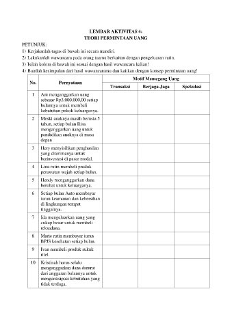 4) Buatlah kesimpulan dari hasil wawancaramu dan kaitkan dengan konsep permintaan uang!