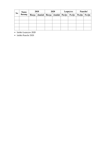 Nama 2018 2020 Laspeyres Paasche! No Barang Harga Jumlah Harga Jumlah Pn.Qo Po.Qo Pn.Qn Po.Qn • Indeks Laspeyres 2020 • Indeks Paasche 2020