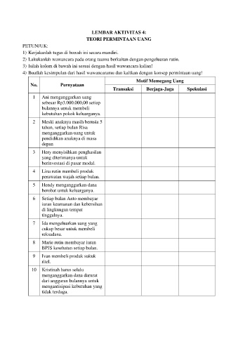 4) Buatlah kesimpulan dari hasil wawancaramu dan kaitkan dengan konsep permintaan uang!