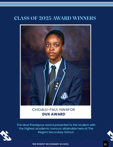 CLASS OF 2025 AWARD WINNERS CHIDALU-PAUL NWAFOR DUX AWARD The Most Prestigous award presented to the student with the highest academic honours attainable here at The Regent Secondary School. ‘’ THE REGENT SECONDARY SCHOOL 22 22 ‘’
