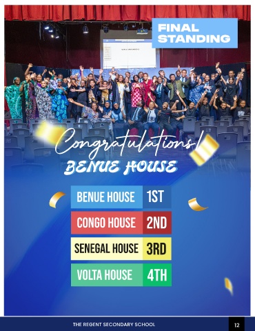 FINAL STANDING Congratulations! BENUE HOUSE BENUE HOUSE BENUE HOUSE 1ST CONGO HOUSE 2ND SENEGAL HOUSE 3RD VOLTA HOUSE 4TH THE REGENT SECONDARY SCHOOL 12 12