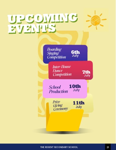 UPCOMING UPCOMING EVENTS EVENTS Boarding Singing 6th Competition July Inter-House Dance 7th Competition July School 10th Production July Prize 11th Giving Ceremony July THE REGENT SECONDARY SCHOOL 21