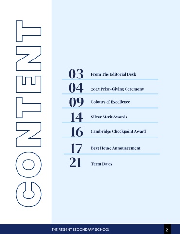 CONTENT 03 From The Editorial Desk 04 2025 Prize-Giving Ceremony 09 Colours of Excellence 14 Silver Merit Awards 16 Cambridge Checkpoint Award 17 Best House Announcement 21 Term Dates THE REGENT SECONDARY SCHOOL 2 2