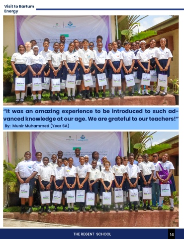 Visit to Bartum Visit to Bartum Energy Energy “It was an amazing experience to be introduced to such ad- vanced knowledge at our age. We are grateful to our teachers!” By: Munir Muhammed (Year 6A) THE REGENT SCHOOL 14 14 THE REGENT SCHOOL 15