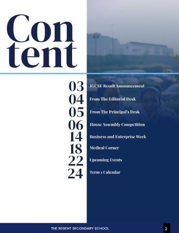 Con tent 03 IGCSE Result Announcement 04 From The Editorial Desk 05 From The Principal’s Desk 06 House Assembly Competition 14 Business and Enterprise Week 18 Medical Corner 22 Upcoming Events 24 Term 1 Calendar THE REGENT SECONDARY SCHOOL 2 2