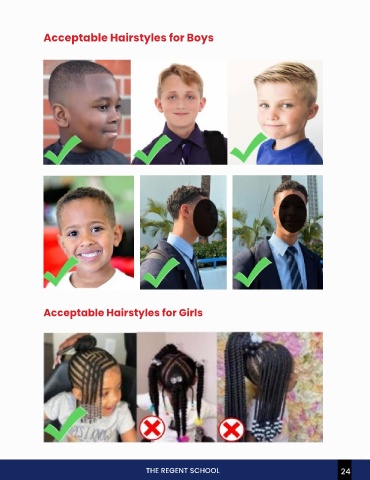 Acceptable Hairstyles for Boys • Blue, White or Trans- parent beads only • No extensions • No hooped earrings Hijab/headwear should be plain white and simple Acceptable Hairstyles for Girls THE REGENT SCHOOL 24 THE REGENT SCHOOL 25 24