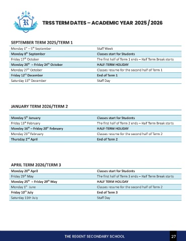 TRSS TERM DATES – ACADEMIC YEAR 2025 / 2026 THE REGENT SECONDARY SCHOOL 27