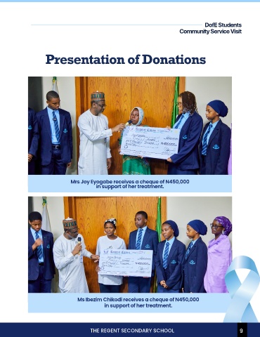 DofE Students Community Service Visit Presentation of Donations Mrs Joy Eyogabe receives a cheque of N450,000 in support of her treatment. Ms Ibezim Chikodi receives a cheque of N450,000 in support of her treatment. THE REGENT SECONDARY SCHOOL 9