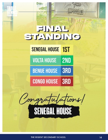 TABLE TENNIS COMPETITION FINAL FINAL STANDING STANDING SENEGAL HOUSE 1ST VOLTA HOUSE 2ND BENUE HOUSE 3RD CONGO HOUSE 3RD Congratulations! SENEGAL HOUSE THE REGENT SECONDARY SCHOOL 14 14