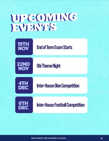 UPCOMING UPCOMING EVENTS EVENTS 19TH NOV End of Term Exam Starts 22ND Obi Theme Night NOV 4TH DEC Inter-House Glee Competition 6TH Inter-House Football Competition DEC THE REGENT SECONDARY SCHOOL 18 18