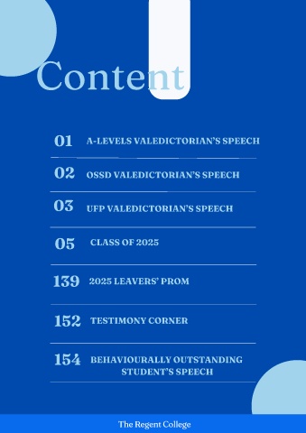 Content 01 A-LEVELS VALEDICTORIAN’S SPEECH 02 OSSD VALEDICTORIAN’S SPEECH 03 UFP VALEDICTORIAN’S SPEECH 05 CLASS OF 2025 139 2025 LEAVERS’ PROM 152 TESTIMONY CORNER 154 BEHAVIOURALLY OUTSTANDING STUDENT’S SPEECH The Regent College The Regent College