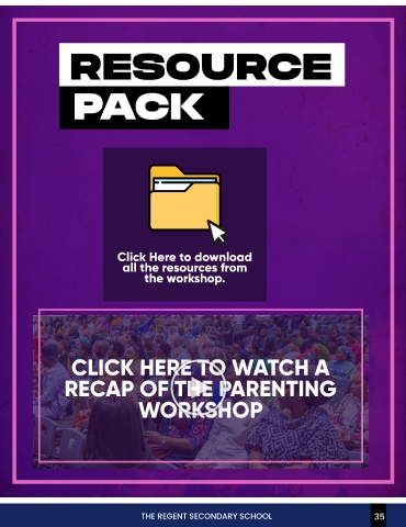 RESOURCE PACK Click Here to download all the resources from the workshop. Thank you RECAP OF THE PARENTING to our Speakers! WORKSHOP CLICK HERE TO WATCH A THE REGENT SECONDARY SCHOOL 34 THE REGENT SECONDARY SCHOOL 35 34