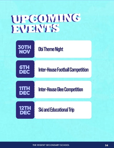 UPCOMING UPCOMING EVENTS EVENTS 30TH Obi Theme Night NOV 6TH DEC Inter-House Football Competition 11TH Inter-House Glee Competition DEC 12TH Ski and Educational Trip DEC THE REGENT SECONDARY SCHOOL 34 34