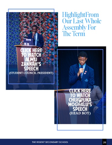 HighlightFrom Our Last Whole Assembly For The Term Click Here to Watch aLIYU ZANNAH’S SPEECH (STUDENT COUNCIL PRESIDENT) Click Here to Watch CHUKWUKA MOGHALU’S SPEECH (HEAD BOY) THE REGENT SECONDARY SCHOOL 26 26
