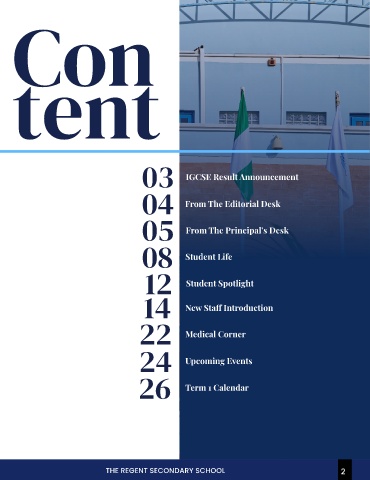 Con tent 03 IGCSE Result Announcement 04 From The Editorial Desk 05 From The Principal’s Desk 08 Student Life 12 Student Spotlight 14 New Staff Introduction 22 Medical Corner 24 Upcoming Events 26 Term 1 Calendar THE REGENT SECONDARY SCHOOL 2 2