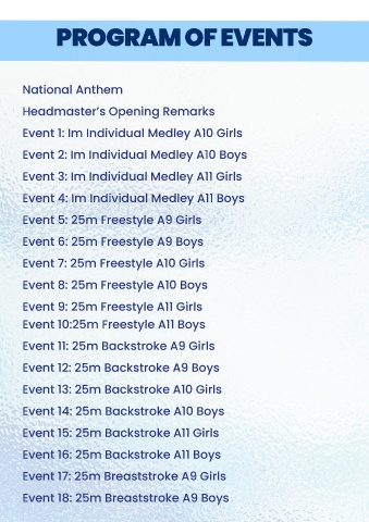 Event 4: Im Individual Medley A11 Boys Event 25: 25m × 4 Freestyle Relay A10 Girls