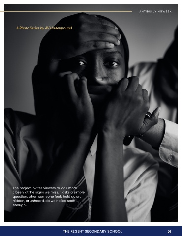 A Photo Series by AV Underground The project invites viewers to look more closely at the signs we miss. It asks a simple question: when someone feels held down, hidden, or unheard, do we notice soon enough? THE REGENT SECONDARY SCHOOL 21