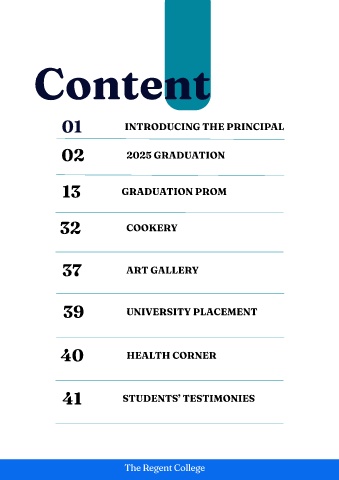 Content 01 INTRODUCING THE PRINCIPAL 02 2025 GRADUATION 13 GRADUATION PROM 32 COOKERY 37 ART GALLERY 39 UNIVERSITY PLACEMENT 40 HEALTH CORNER 41 STUDENTS’ TESTIMONIES The Regent College