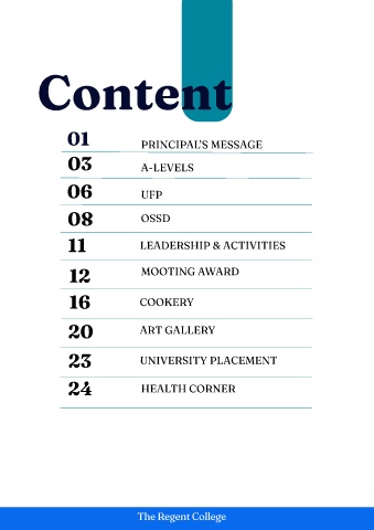 Content 01 PRINCIPAL’S MESSAGE 03 A-LEVELS 06 UFP 08 OSSD 11 LEADERSHIP & ACTIVITIES 12 MOOTING AWARD 16 COOKERY 20 ART GALLERY 23 UNIVERSITY PLACEMENT 24 HEALTH CORNER The Regent College