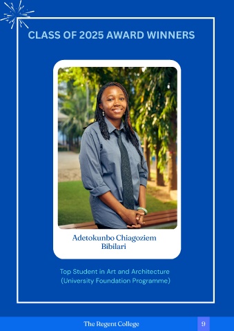CLASS OF 2025 AWARD WINNERS Adetokunbo Chiagoziem Bibilari Top Student in Art and Architecture (University Foundation Programme) The Regent College 9