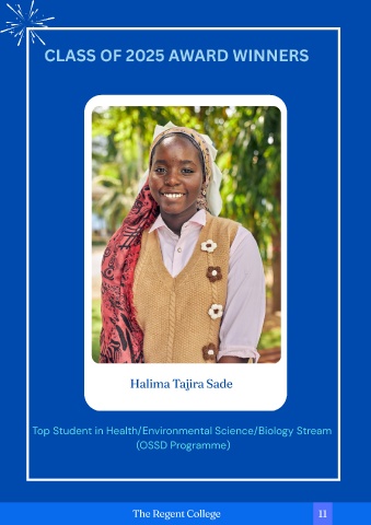CLASS OF 2025 AWARD WINNERS Halima Tajira Sade Top Student in Health/Environmental Science/Biology Stream (OSSD Programme) The Regent College 11