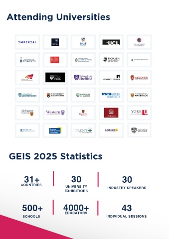 Attending Universities GEIS 2025 Statistics 31+ 30 30 COUNTRIES UNIVERSITY INDUSTRY SPEAKERS EXHIBITIORS 500+ 4000+ 43 EDUCATORS SCHOOLS INDIVIDUAL SESSIONS