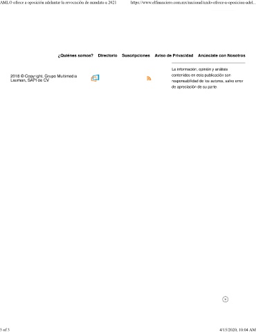 AMLO ofrece a oposición adelantar la revocación de mandato a 2021 https://www.elfinanciero.com.mx/nacional/amlo-ofrece-a-oposicion-adel... 3 of 3 4/15/2020, 10:04 AM