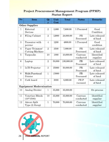 No Item Qt Unit Total Status Remarks occurrence of Pandemic (COVID 19), financial constraints,