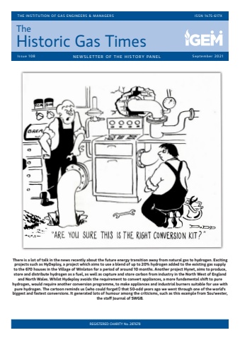 Issue 108NEWSLETTER OF THE HISTORY PANELSeptember 2021THE INSTITUTION OF GAS ENGINEERS & MANAGERSISSN 1475-617XREGISTERED CHARITY No. 287678TheHistoric Gas TimesThere is a lot of talk in the news recently about the future energy transition away from natural gas to hydrogen. Exciting projects such as HyDeploy, a project which aims to use a blend of up to 20% hydrogen added to the existing gas supply to the 670 houses in the Village of Winlaton for a period of around 10 months. Another project Hynet, aims to produce, store and distribute hydrogen as a fuel, as well as capture and store carbon from industry in the North West of England and North Wales. Whilst Hydeploy avoids the requirement to convert appliances, a more fundamental shift to pure hydrogen, would require another conversion programme, to make appliances and industrial burners suitable for use with pure hydrogen. The cartoon reminds us (who could forget!) that 50-odd years ago we went through one of the world's biggest and fastest conversions. It generated lots of humour among the criticisms, such as this example from Sou'wester, the staff Journal of SWGB.
