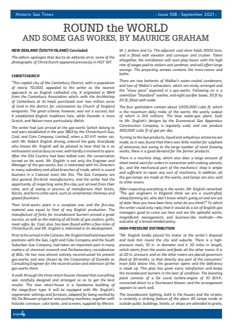 pagepage4Historic Gas Times%u2022 Issue 108 %u2022 September 2021 %u2022NEW ZEALAND (SOUTH ISLAND) Concluded.The editors apologise that due to an editorial error, some of the photographs of Christchurch appeared previously in HGT 107.CHRISTCHURCH%u201cThis capital city of the Canterbury District, with a population of nearly 70,000, appealed to the writer as the nearest approach to an English cathedral city. It originated in 1849 from the Canterbury Association which, with the Archbishop of Canterbury at its head, purchased over two million acres of land in the district for colonization by Church of England emigrants. The great scheme, however, was not a success; but it established English traditions here, while Dunedin is more Scotch, and Nelson more particularly Welsh.The writer had just arrived at the gas-works (which belong to and were established in the year 1863 by the Christchurch Gas, Coal, and Coke Company, Limited), when a 20 H.P. motor car, with Mr. Robert English driving, entered the gate. Everybody who knows Mr. English will be pleased to hear that he is as enthusiastic and as busy as ever, with hardly a moment to spare. After the Old Country had been talked over, the conversation turned on his work. Mr. English is not only the Engineer and Manager of the gas-works, but is interested with his Directors in many subsidiary and allied branches of trade, which is sound business in a Colonial town like this. The Gas Company are also general fire-brick manufacturers, and the writer had the opportunity of inspecting some fire-clay just arrived from their mine, and of seeing in process of manufacture their bricks, blocks, and terra-cotta work, such as ornamental chimneys and glazed fountains.Their brick-works plant is a complete one; and the fire-clay material was equal to that of any English production. The manufacture of forks for incandescent burners proved a great success, as well as the making of all kinds of gas cookers, grills, meat safes, &c. Coal, also, has been found within a few miles of Christchurch; and Mr. English is interested in its development.Prior to his arrival in the Colonies, Mr. English had held important positions with the Gas, Light and Coke Company and the South Suburban Gas Company, had taken an important part in many matters of chemical research and Parliamentary consideration of Bills. He has now almost entirely reconstructed his present gas-works, and was chosen by the Corporation of Dunedin as Consulting Engineer for the reconstruction and extension of the gas-works there.A walk through the three retort-houses showed that everything was carefully designed and arranged so as to get the best results. The new retort-house is a handsome building of the stage-floor type. It will be equipped with Mr. English%u2019s regenerator settings and furnaces, adapted for being worked by the De Brouwer projector and pushing machines, together with hotcoke conveyor, coke tanks, and screens, supplied by Messrs. W. J. Jenkins and Co. The adjacent coal-store holds 3000 tons, and is fitted with elevator and conveyor and crusher. Taken altogether, the installation will soon play havoc with the high rate of wages paid to stokers and yardmen, and will effect large savings. The projecting annexe contains the mess-rooms and baths.There are two batteries of Walker%u2019s water-cooled condensers, and two of Waller%u2019s exhausters, which are nicely arranged and the %u201cshow piece%u201d expected in a gas-works. Following on is a onemillion %u201cStandard%u201d washer, and eight purifier boxes, 30 ft by 20 ft, filled with oxide.The four gasholders contain about 1,000,000 cubic ft, which is the maximum daily make of the works, the yearly output of which is 245 millions. The blue water-gas plant, built to Mr. English%u2019s designs by the Economical Gas Apparatus Construction Company, is regularly used, and can produce 300,000 cubic ft of gas per day.Turning to the bye-products, liquid and anhydrous ammonia are made, as it was found that there was little market for sulphate of ammonia; but owing to the large number of meat freezing works, there is a good demand for the former products.There is a machine shop, which also does a large amount of sheet-metal work for orders in connection with cooking utensils, &c.; and the mechanical part of the mechanics%u2019 shop is ample and sufficient to repair any sort of machinery. In addition, all the gas-lamps are made at the works; and lamps are also sold to other towns.After inspecting everything in the works, Mr. English remarked: %u201cThe gas engineers in England think we are a countryfied, sheep-farming lot, who don%u2019t know what%u2019s going on and are out of date. Now you have been here, what do you think?%u201c To which the writer could only reply that it would do a lot of English gas managers good to come out here and see the splendid works, magnificent management, and business-like methods%u2014the outcome of a broad-minded policy.HIGH-PRESSURE DISTRIBUTION%u201cMr. English kindly placed his motor at the writer%u2019s disposal and took him round the city and suburbs. There is a highpressure main, 10 in. in diameter and 4 1/2 miles in length, which starts from the works and feeds all the other mains. It is at 20 in. pressure, and on the other mains are placed governors fixed at 30-tenths, so that directly any part of the consumers%u2019 main falls below this, the governor opens and the deficiency is made up. This plan has given every satisfaction and keeps the incandescent burners in the best of condition. The boosting plant consists of a De Laval turbine-engine of 1O B.H.P., connected direct to a Sturtevant blower; and the arrangement appears to work well.The incandescent lighting, both in the houses and the streets, is certainly a striking feature of the place. All lamps inside or outside public buildings, hotels, or shops are attended to gratis,ROUND the WORLDAND SOME GAS WORKS, BY MAURICE GRAHAM