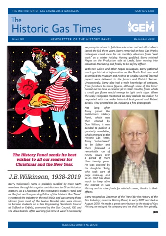 Issue 101NEWSLETTER OF THE HISTORY PANELDecember 2019THE INSTITUTION OF GAS ENGINEERS & MANAGERSISSN 1475-617XREGISTERED CHARITY No. 287678TheHistoric Gas TimesBarry Wilkinson%u2019s name is probably recalled by most IGEM members through his regular contributions to Gi on historical matters, as a Chairman of the Institution%u2019s History Panel and as the first and long-serving Editor of the %u2018Historic Gas Times%u2019. He entered the industry in the mid-1950s and was among those (drawn from most of the twelve Boards) who were chosen to become students on a Gas Engineering %u2018Sandwich Course%u2019 at Salford or Enfield, promoted by the Gas Council, IGE and the Area Boards. After working full time it wasn%u2019t necessarily very easy to return to full-time education and not all students lasted the full three years. Barry remarked on how Gas Works colleagues could view his six monthly absences from %u201creal work%u201d as a winter holiday. Having qualified, Barry rejoined Negas on the Production side at Leeds, later moving into Industrial Marketing and finally to be Safety Officer.With Ken Golisti and other Negas colleagues, Barry gathered much gas historical information on the North East area and assembled the Museum and Archive at Tingley. Several %u2018learned papers%u2019 were delivered to the Juniors and District Section. Unexpectedly, Barry also had a wide knowledge of antiques, from furniture to brass figures, although some of the latter turned out to have a ceramic jet in their mouths, from which a small gas flame would emerge to light one%u2019s cigar. When the Daily Telegraph mentioned an early bedside tea maker, he responded with the wider historical background and Patent details. They printed the lot, including a fine photograph.Not long after Barry joined the Institution%u2019s History Panel, which was then chaired by Don Wilson, it was decided to publish a quarterly newsletter, which emerged as the Historic Gas Times. Barry %u201cvolunteered%u201d to be Editor and there followed a remarkable run of ninety issues over a period of more than twenty years. He was assisted by his daughter Sally, who took care of page make-up, and so on. HGT has done much to keep alive the interest in Gas History and to raise funds for related causes, thanks to their efforts.Barry resigned as Chairman of the %u2018Panel for the History of the Gas Industry%u2019, now the History Panel, in early 2017 and died in August 2019. He made a great contribution to the study of Gas History, we enjoyed his company and we shall miss him greatly.JBHThe History Panel sends its best wishes to all our readers for Christmas and the New Year.J.B.Wilkinson, 1938-2019