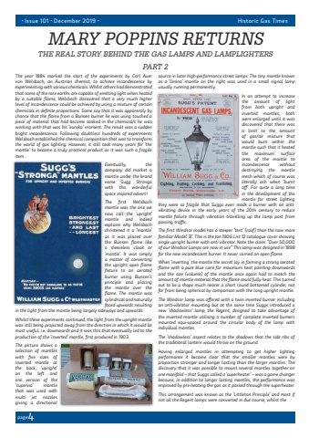 pagepage44%u2022 Issue 101 %u2022 December 2019 %u2022Historic Gas TimesThe year 1884 marked the start of the experiments by Carl Auer von Welsbach, an Austrian chemist, to achieve incandescence by experimenting with various chemicals. Whilst others had demonstrated that some of the rare earths are capable of emitting light when heated by a suitable flame, Welsbach discovered that a very much higher level of incandescence could be achieved by using a mixture of certain chemicals in definite proportions. Some say that it was apparently by chance that the flame from a Bunsen burner he was using touched a piece of material that had become soaked in the chemical/s he was working with that was his %u2018eureka%u2019 moment. The result was a sudden bright incandescence. Following doubtless hundreds of experiments Welsbach established the chemical composition that was to transform the world of gas lighting. However, it still took many years for %u2018the mantle%u2019 to become a truly practical product as it was such a fragile item.Eventually, the company did market a mantle under the brand name Sugg Stronga with this wonderful space inspired advert!The first Welsbach mantle was the one we now call the %u2018upright%u2019 mantle and indeed explains why Welsbach christened it a %u2018mantle%u2019 as it was placed over the Bunsen flame like a sleeveless cloak or %u2018mantle%u2019. It was simply a matter of converting the upright open flame fixture to an aerated burner using Bunsen%u2019s principle and placing the mantle over the flame. The mantle was cylindrical and naturally faced upwards resulting in the light from the mantle being largely sideways and upwards.Whilst these experiments continued, the light from the upright mantle was still being projected away from the direction in which it would be most useful, i.e. downwards and it was this that eventually led to the production of the %u2018inverted%u2019 mantle, first produced in 1903.The picture shows a selection of mantles with five sizes of inverted mantle at the back, %u2018upright%u2019 on the left and one version of the %u2018supervia%u2019 mantle that was used with multi jet nozzles giving a directional source in later high-performance street lamps. The tiny mantle known as a %u2018limina%u2019 mantle on the right was used in a small signal lamp usually running permanently.In an attempt to increase the amount of light from both upright and inverted mantles, both were enlarged until it was discovered that there was a limit to the amount of gas/air mixture that would burn within the mantle such that it heated the maximum surface area of the mantle to incandescence without destroying the mantle mesh which of course was literally ash when %u2018burnt off%u2019. For quite a long time in the development of the mantle for street lighting they were so fragile that Suggs even made a burner with an antivibrating device in the early years of the 20th century to reduce mantle failure through vibration travelling up the lamp post from passing traffic.The first Windsor model has a steeper %u2018tent%u2019 (roof) than the now more familiar Model %u2018B%u2019. This is the Jan 1906 List 12 catalogue cover showing single upright burner with anti vibrator. Note the claim %u201cOver 50,000 of our Windsor Lamps are now in use%u201d This lamp was designed in 1898 for the new incandescent burner. It never carried an open flame.When %u2018inverting%u2019 the mantle the secret lay in forming a strong aerated flame with a pure blue cone for maximum heat pointing downwards and the size (volume) of the mantle once again had to match the amount of mantle material that the flame could fully heat. This turned out to be a shape much nearer a short round bottomed cylinder, not far from being spherical by comparison with the long upright mantle.The Windsor lamp was offered with a twin inverted burner including an anti-vibrator mounting but at the same time Suggs introduced a new %u2018shadowless%u2019 lamp, the Regent, designed to take advantage of the inverted mantle utilising a number of complete inverted burners mounted equi-spaced around the circular body of the lamp with individual mantles.The %u2018shadowless%u2019 aspect relates to the shadows that the side ribs of the traditional lantern would throw on the ground.Having enlarged mantles in attempting to get higher lighting performance it became clear that the smaller mantles were by proportion stronger and longer lasting than the larger mantles. The discovery that it was possible to mount several mantles together on one manifold %u2013 that Suggs called a %u2018superheater%u2019 %u2013 was a game changer because, in addition to longer lasting mantles, the performance was improved by pre-heating the gas as it passed through the superheater.This arrangement was known as the %u2018Littleton Principle%u2019 and most if not all the Regent lamps were converted in due course, whilst the MARY POPPINS RETURNSTHE REAL STORY BEHIND THE GAS LAMPS AND LAMPLIGHTERSPART 2